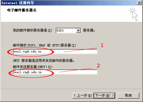 5. 点下一步,在1、2处分别输入邮件服务器地址,例如:中国地质大学(北京) http://www.126.com/ 的邮箱服务器设置是 POP3服务器(P):mail.cugb.edu.cn; SMTP服务器(S):mail.cugb.edu.cn