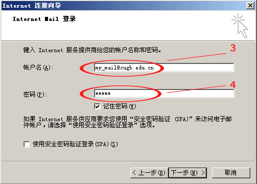6. 点下一步,在3、4处分别输入帐户名和密码,记着在3处一定要输入完整的Email地址,例如这里输入[email protected] 而不是 my_email ; 若在记住密码 处点勾,下次访问就不必再输入密码