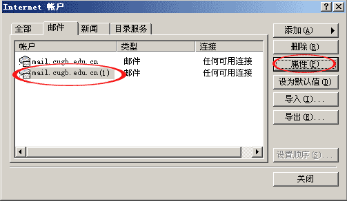 此时,帐号已添加成功,如下图所示,帐号中已多了一个mail.cugb.edu.cn(1)的。此时选中该帐号,然后点属性。