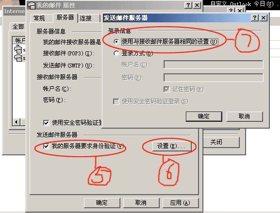 9. 然后再点服务器标签,如下图,在5的位置打上对号,然后点6处的设置,选择7处的对应选项。点确定并关闭所有属性窗口。
