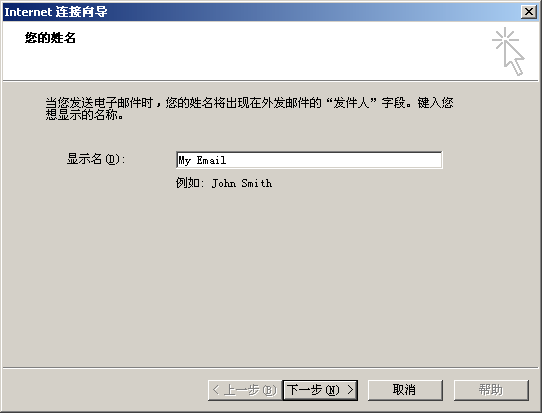 6. 点下一步,在3、4处分别输入帐户名和密码,记着在3处一定要输入完整的Email地址,例如这里输入