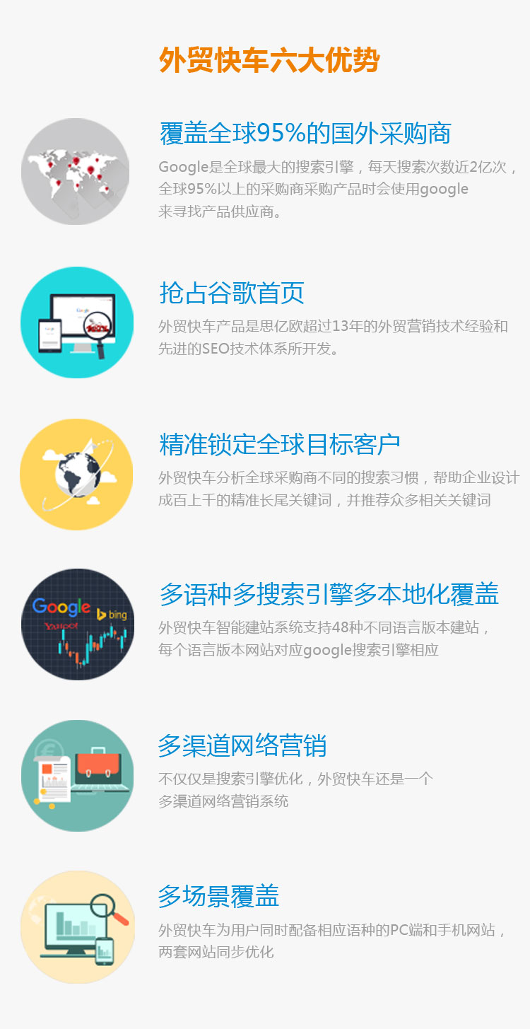 外贸快车 (证券简称:思亿欧 证券代码:839255)是一套为外贸企业定制的以SEO为核心的智能网络营销系统平台。独创WMM功能体系,帮助外贸企业建立多语种欧美风格官方网站,通过先进的SEO技术和多渠道网络营销,实现全球推广和新兴市场开发。