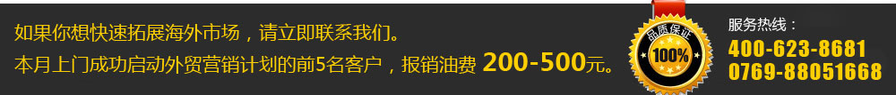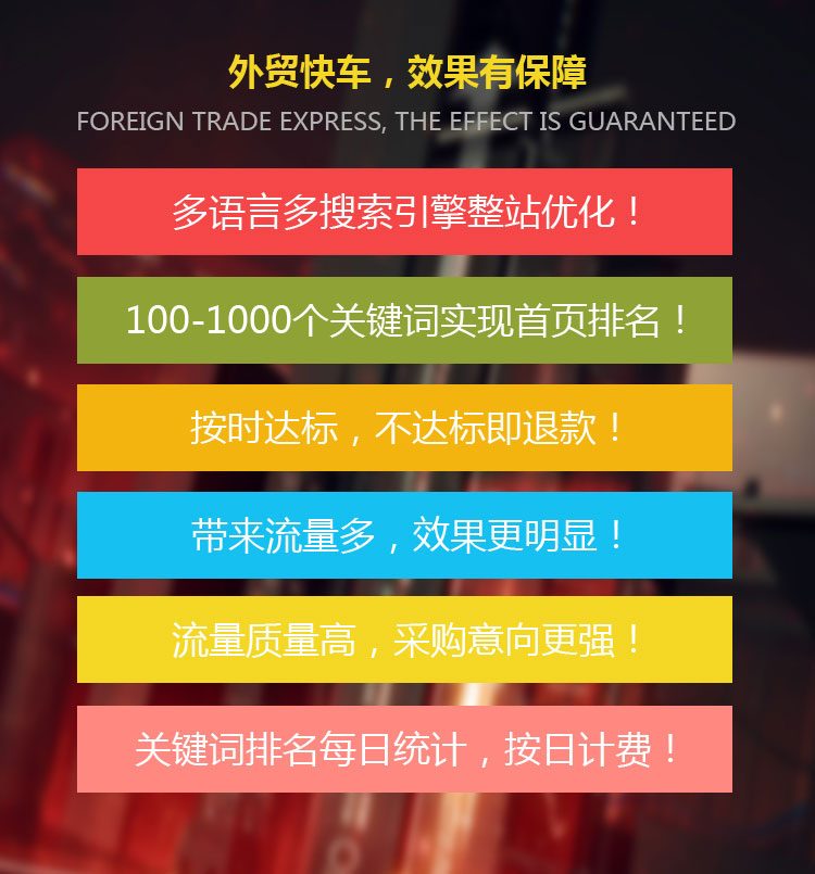 推广只是手段,并不是最终的目标,外贸推广的最终目的是为您带来高质量询盘,获得客户;与绝大多数网络推广不同,外贸快车不仅仅可以实现100-1000个关键点首页排名,带来大量精准流量,更集成了网络营销系统和智能监控系统,从而为客户带来大量的订单。